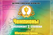 Поздравляем Ибатуллину Арину, занявшую 3 место во Всероссийском конкурсе «Чемпионы» (педагог Котельникова Е.В.). Молодцы! Желаем дальнейших успехов.