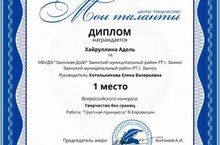 Поздравляем Хайруллину Адель, занявшую 1 место во Всероссийском конкурсе «Творчество без границ» (педагог Котельникова Е.В.). Молодцы! Желаем дальнейших успехов.