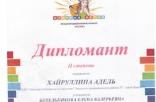 Поздравляем Хайруллину Адель, дипломанта II степени Международного интернет-конкурса «Озорная весна» (педагог Котельникова Е.В.). Молодцы! Желаем дальнейших успехов!