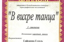 Поздравляем солистку Образцового детского хореографического коллектива «Каприз» Гафурову Гузель, занявшую 1 место в открытом Республиканском конкурсе хореографических коллективов «В вихре танца» (педагог Маркелова Р.А.)