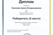 Поздравляем Сергееву Арину, занявшую 2 место во Всероссийском творческом конкурсе «Рассударики» (педагог Яруллина Г.Ф.). Молодцы! Желаем дальнейших успехов!