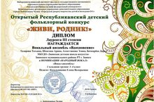 Поздравляем Вокальный ансамбль «Вдохновение», ставшего Лауреатом III степени Открытого Республиканского детского фольклорного конкурса «ЖИВИ, РОДНИК!» (ПДО Котельникова Е.В.)