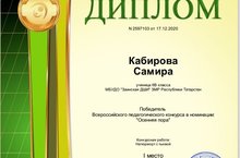 Учащаяся отделения изобразительного искусства Кабирова Самира приняла активное участие во Всероссийском педагогическом конкурсе в номинации «Осенняя пора» и стала победителем – I место (ПДО Васильева В.Н.). Поздравляем!!!