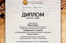 Учащийся отделения музыкального искусства Мезин И. принял активное участие в VIII Международном конкурсе для детей и молодежи «Юные таланты» и стал победителем – I место (ПДО Инюшева М.М.). Поздравляем!!!