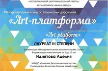 Поздравляем Идиятову А., учащуюся отделения музыкального искусства, ставшую Лауреатом III степени V Международного конкурса творческих дарований «АРТ-платформа» (ПДО Безносова Е.М.)