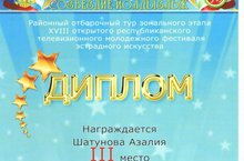 20 февраля определились победители муниципального этапа Республиканского конкурса «Созвездие – Йолдызлык», в котором приняла участие Шатунова Азалия в номинации "Вокал-соло" и была награждена дипломом за ІІІ место (педагог Инюшева М.М.).