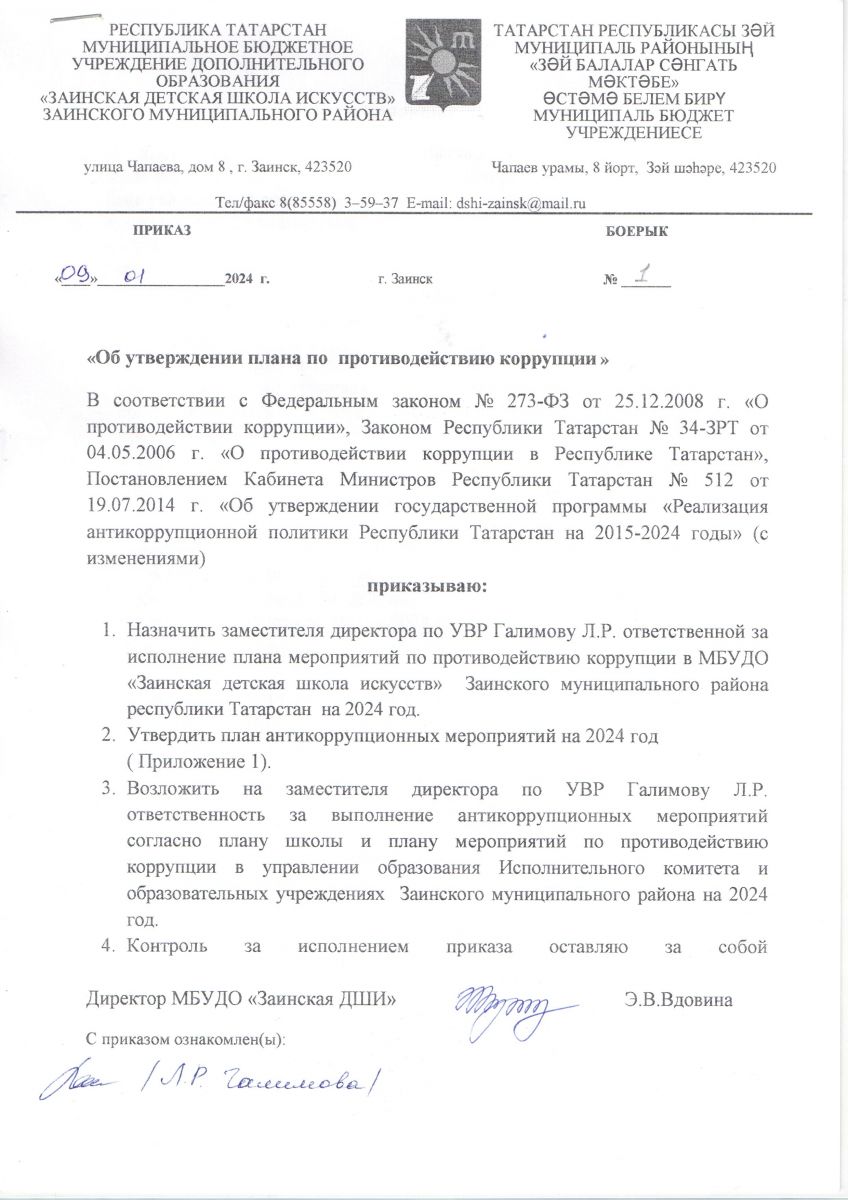 План антикоррупционных мероприятий МБУДО "Заинская ДШИ" на 2024 год