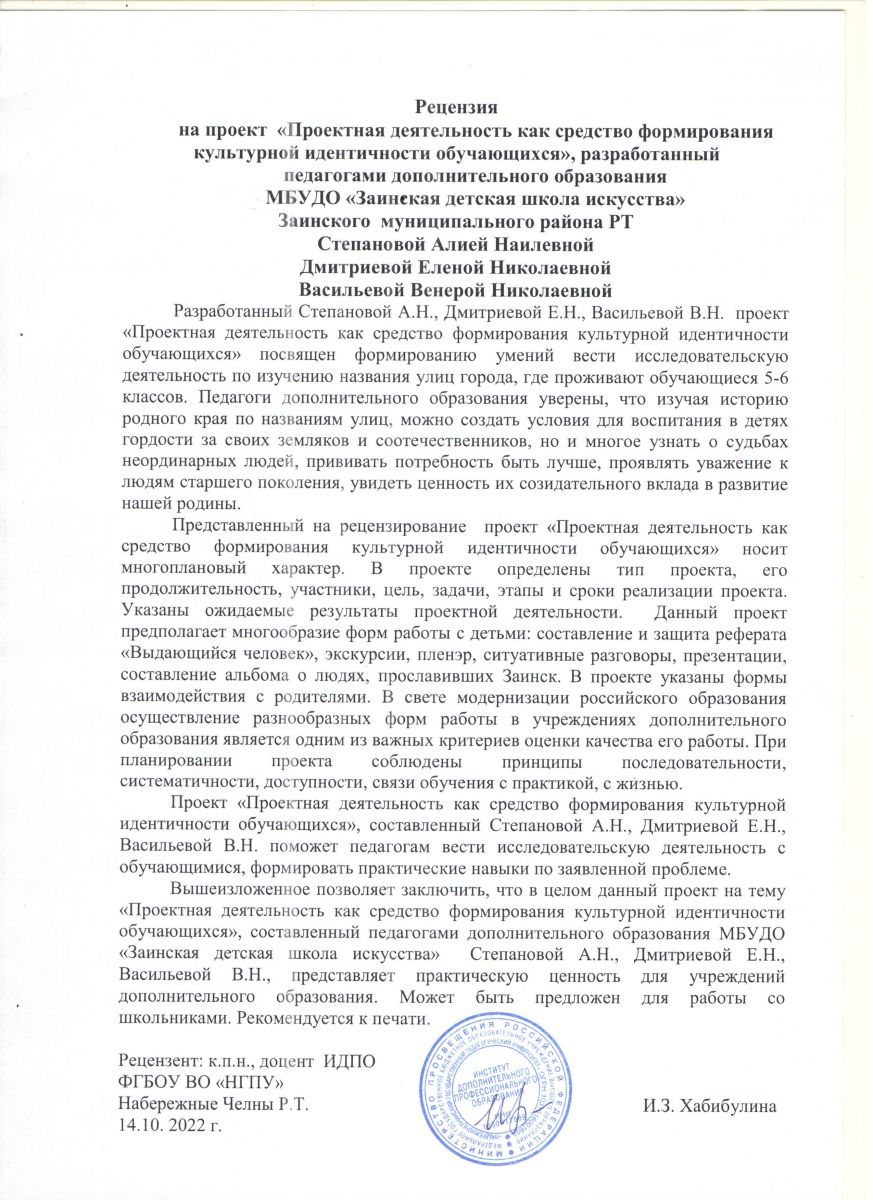 Рецензия на проект «Проектная деятельность как средство формирования культурной идентичности обучающихся».