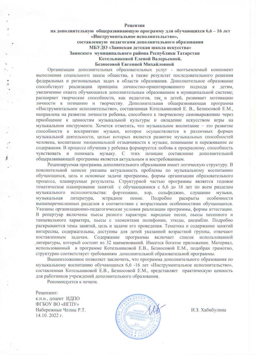 Рецензия на дополнительную общеразвивающую программу для обучающихся 6,6-16 лет «Инструментальное исполнительство».
