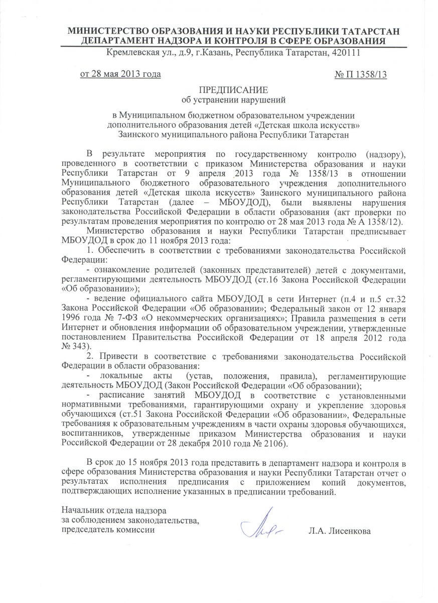 Предписание об устранении нарушений в МБУДО "Заинская ДШИ" ЗМР РТ от 28 марта 2018 года № П911/18-Д