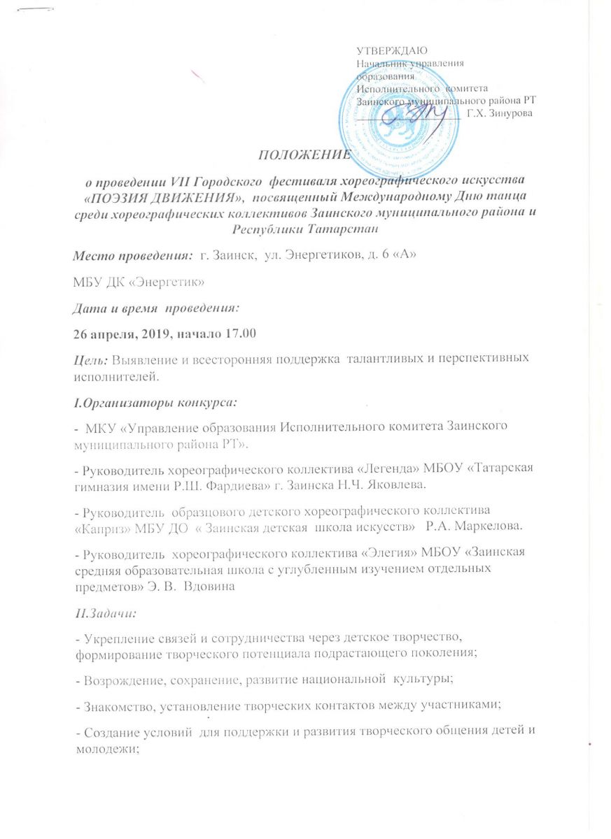 Положение О проведении VІІ городского фестиваля хореографического искусства «ПОЭЗИЯ ДВИЖЕНИЯ», посвященный Международному Дню танца среди хореографических коллективов Заинского муниципального района и Республики Татарстан