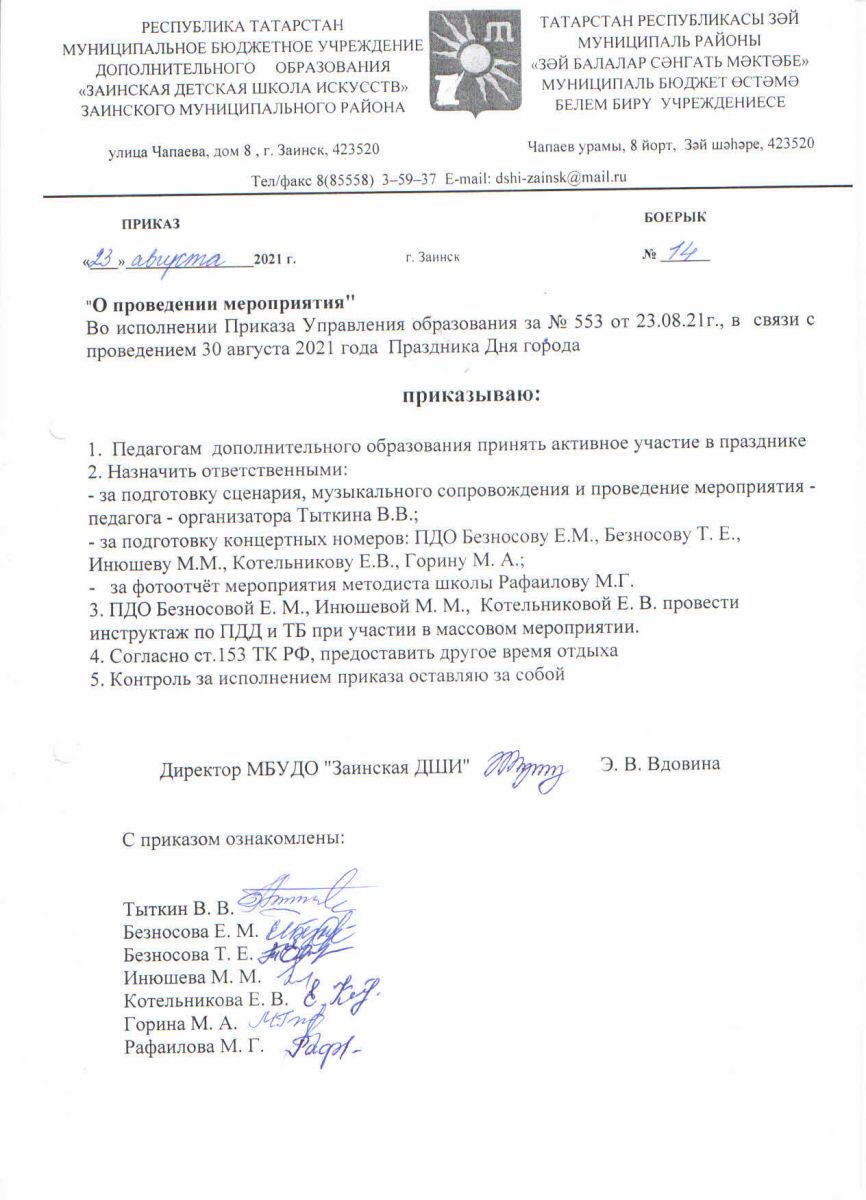 Приказ №14 от 23.08.2021 г. «О проведении мероприятия»