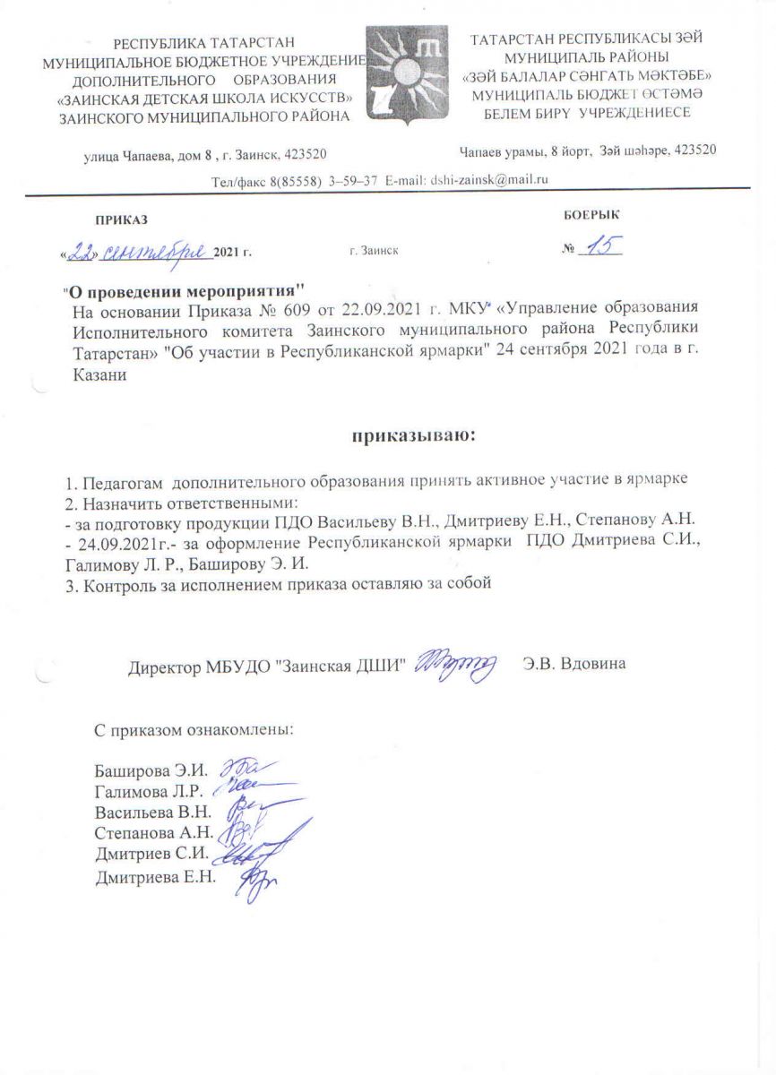 Приказ №609 от 22.09.2021г. «Об участии в Республиканской Ярмарке-2021.»