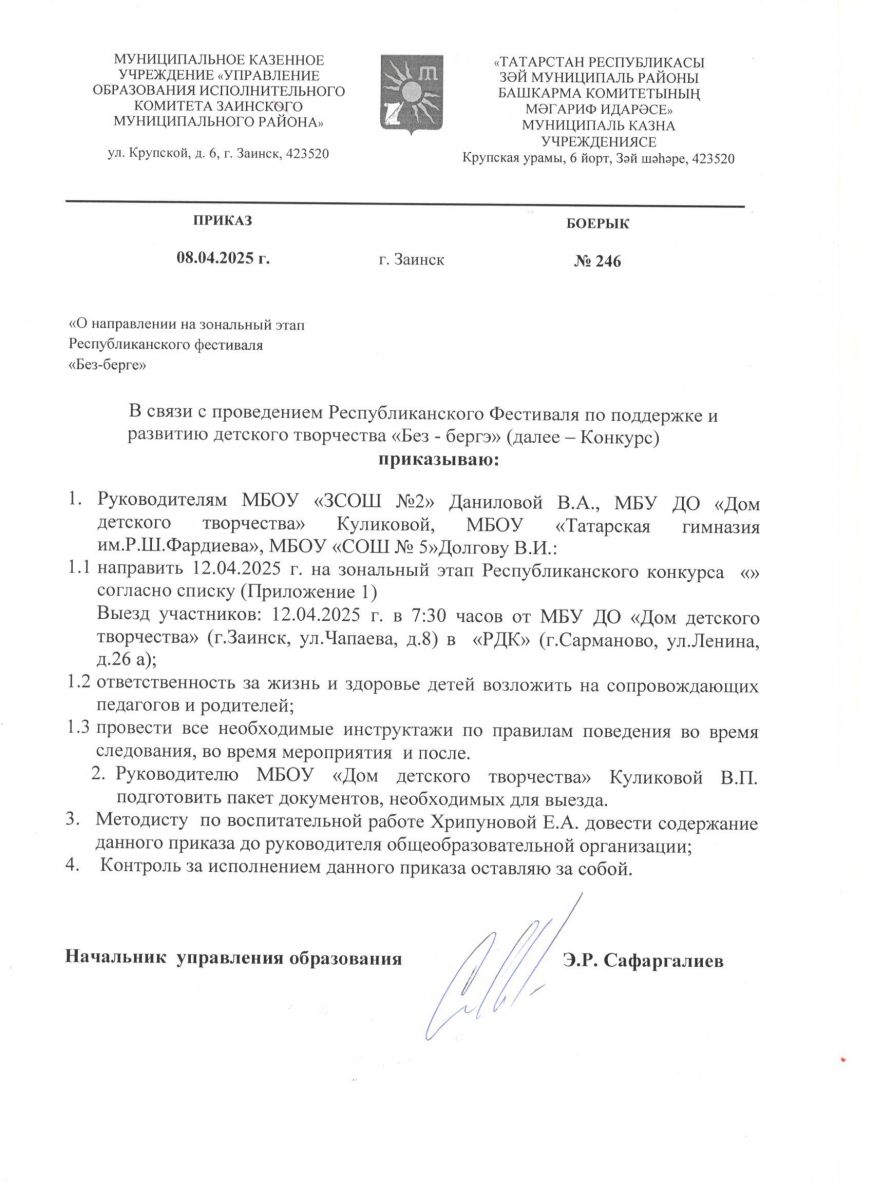 Приказ №246 от 08.04.2025 г. «О направлении на зональный этап Республиканского фестиваля народного творчества «Без бергэ»