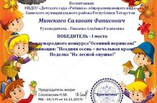 4 октября воспитанница подготовительной группы ДОУ «Рябинка» Насырова Самира приняла участие в открытом региональном конкурсе детского творчества «Золотой петушок» город Казань в номинации «Вокальное творчество». Она исполнила вокальное произведение «Утренняя песенка», где она стала лауреатом второй степени и получила в подарок книгу и сладкое угощение. Поздравляем !!!