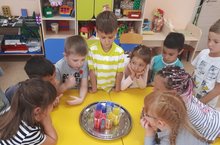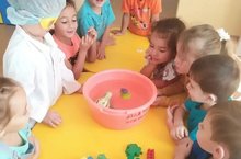 Сегодня дети старшей группы проводили опыт с водой " Тонет - не тонет". Они приобщались к навыкам экспериментирования, высказывали предположения, делали выводы (тяжёлые предметы тонут, а лёгкие плавают).