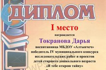 ПОЗДРАВЛЯЕМ ТОКРАНОВУ ДАРЬЮ С ПОБЕДОЙ В IV МУНИЦИПАЛЬНОМ КОНКУРСЕ ИССЛЕДОВАТЕЛЬСКИХ РАБОТ И ПРОЕКТОВ ДЕТЕЙ СТАРШЕГО ДОШКОЛЬНОГО ВОЗРАСТА "Я ТЕБЕ ОТКРОЮ ТАЙНУ". РУКОВОДИТЕЛЬ ПРОЕКТА: "ПОЛЕЗНЫЕ СВОЙСТВА ЛИМОНА" УРАЗАЙКИНА РАНИЯ ВАХИТОВНА