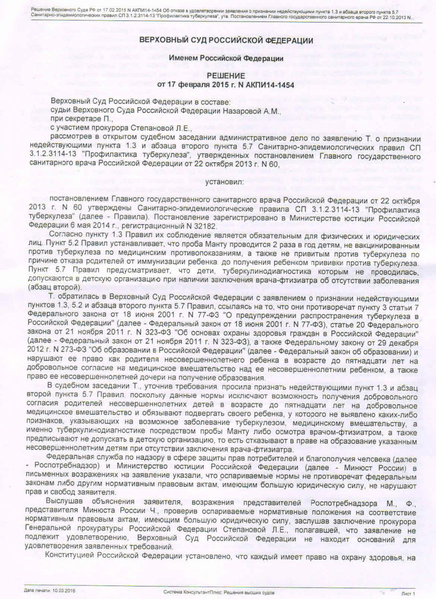 Разъяснения правового обоснования при отказах от туберкулинодиагностики и обследования у врача - фтизиатра среди родительской общественности.