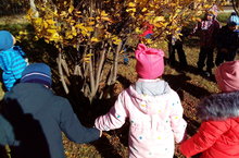 Наступила золотая осень – на улице уже не так тепло, но солнышко ещё нас радует! Сегодня небольшой скверик нашего детского сада превратился для ребят в сказочный осенний лес. Мы любовались красками осени, рассматривали ягоды черёмухи, саженцы рябины, ёлки, нарядно одетую берёзку. Дети с удовольствием играли в весёлые музыкальные игры: «Сказочный лес», «Змейка», «А нас дождик не намочит!», «По кочкам», пели осенние песни.
