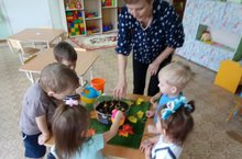 Необычное занятие ожидало сегодня детей в первой младшей группы. Воспитатель Шивирева Р. Р. показала, как надо сажать лук. Детям было интересно услышать рассказ о луке, что он (круглый, желтый, есть верхушка, корешки). Также узнали, что он горький, но в нем много витаминов. И , если посадить лук, то из него вырастут зеленые листики-пёрышки. А чтобы лук вырос, его нужно рыхлить и поливать. И вот теперь на подоконнике группы появился свой мини - огород, за которым будут вести наблюдение детишки и воспитатели. Будем ждать результатов.
