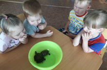 Рано утром во второй младшей группе появилась необычная коробка, из которой доносились непонятные звуки. Дети были так удивлены, когда увидели в ней маленьких черепашек. С большим интересом все наблюдали за интересными животными. Вместе с воспитателем дети рассмотрели у черепахи панцирь, а под ним увидели лапы и маленький хвостик. Ребята увидели, как черепашки плавают в воде, как забавно вытаскивают голову из воды. И, конечно же, посмотрели мультфильм "Львёнок и черепаха" при этом весело подпевая песенку черепашки.