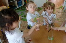 Дети второй младшей группы, вместе с воспитателем Мартыновой Н.Р., наблюдали за веточками, стоявшими в вазе в группе. Воспитатель обратила внимание детей на то, что почки на веточках уже раскрылись и показывают нам зелёные листочки. А всё это происходит только потому, что в группе тепло. А на улице ещё холодно, солнце пригревает, но недостаточно, чтоб набухали почки на ветках деревьев. Ребята долго рассматривали веточки, стоящие в вазе.