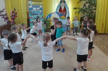 В осеннюю пору сбора урожая дети старшей группы вместе с воспитателем по обучению татарскому языку разучивают хороводную игру "Бар матур бакча". Ребята одевают полумаски овощей, танцуют и поют. Они только выучили названия овощей на татарском языке, а эта игра помогает закрепить пройденную тему. Дети играют в эту хороводную игру с большим удовольствием.