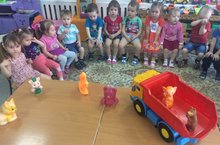 С целью закрепления названий животных воспитатель 1 младшей группы Мартынова Н.Р.организовала со своим воспитанниками игру «Прокати зверушку». В группу приехал волшебный грузовик. Сколько радости испытали малыши при встрече с мишуткой, лисичкой и белочкой. Ребята с удовольствием познакомились с гостями, каждый назвал свое имя при встрече. Затем малыши пригласили животных покататься, используя в речи слова вежливости. В конце зверушки поблагодарили ребят и отправились в лес. А малыши не забыли пригласить зверушек чаще приходить к ним в гости.