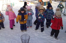 Зима – волшебное время. Одеваемся и идем на прогулку, сообщает своим ребятам воспитатель средней группы Арсланова Р.И. Одной из игр на прогулке, в которую очень любят играть ребята – это «Зимний баскетбол». А все началось с того что ребята с удовольствие налепили много снежков, а воспитатель предложила забрасывать эти снежки в корзину. Чтобы игра стала интересней, разделились на две команды и начались соревнования «Кто больше забросит снежков». Теперь выходя на прогулку ребята с удовольствием самостоятельно организуют игру, используя для метания ведро, «ватрушку» на которой только что катались с горки. Вот уж где не замерзнешь, даже в мороз!