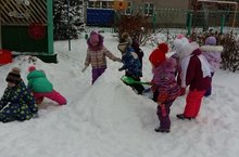 14 января дети средней группы совместно с воспитателем Агзамовой Г.Х. строили снежную горку. Положительное отношение к трудовой деятельности с детства определяют будущее маленького человека. Заботясь о нём, мы заботимся о том, чтобы он был трудолюбив, тем самым развиваем у него нравственные качества . Дети с удовольствием носили снег своими лопаточками, в глазах каждого ребёнка сияло счастье от того, что он вносит вклад в общее дело.