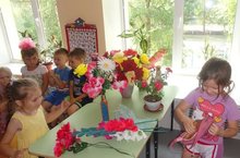 Подарки всегда приятно не только получать,но и дарить. А если дарить подарок,сделанный своими руками, то вдвойне приятно. 15 июля Самигуллина В.Р. с детьми старшей “Б” группы подготовили подарки “Цветы в вазе “ для своих родителей. Для этого они использовали картон и разнообразные цветы.Вспоминали названия цветов,смотрели картинки,слушали стихи и отгадывали загадки.Подарки получились красивые.