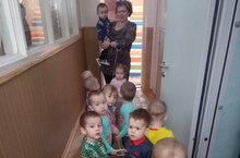 Воспитанники ясельной группы совместно с воспитателем Калимуллиной Н.А. изучая детский сад направляются в физкультурный зал