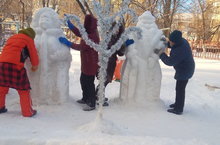 Наша творческая группа вносит свою лепту и в оформлении города к новому году. Вылепили из снега символ уходящего и грядущего года в парке им.Р.Ш.Фардиева.