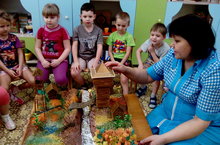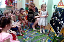 Воспитатель средней «А» группы Гришина И.И. познакомила детей с информационной дидактической игрой «Расскажи про свой город». Информативные картинки с изображениями городских учреждений служат удобным материалом для бесед в группах детского сада и индивидуальных занятий. Используя данный материал, детям предлагается составить рассказ о кинотеатре, скульптурах, ледовом дворце и т.д.