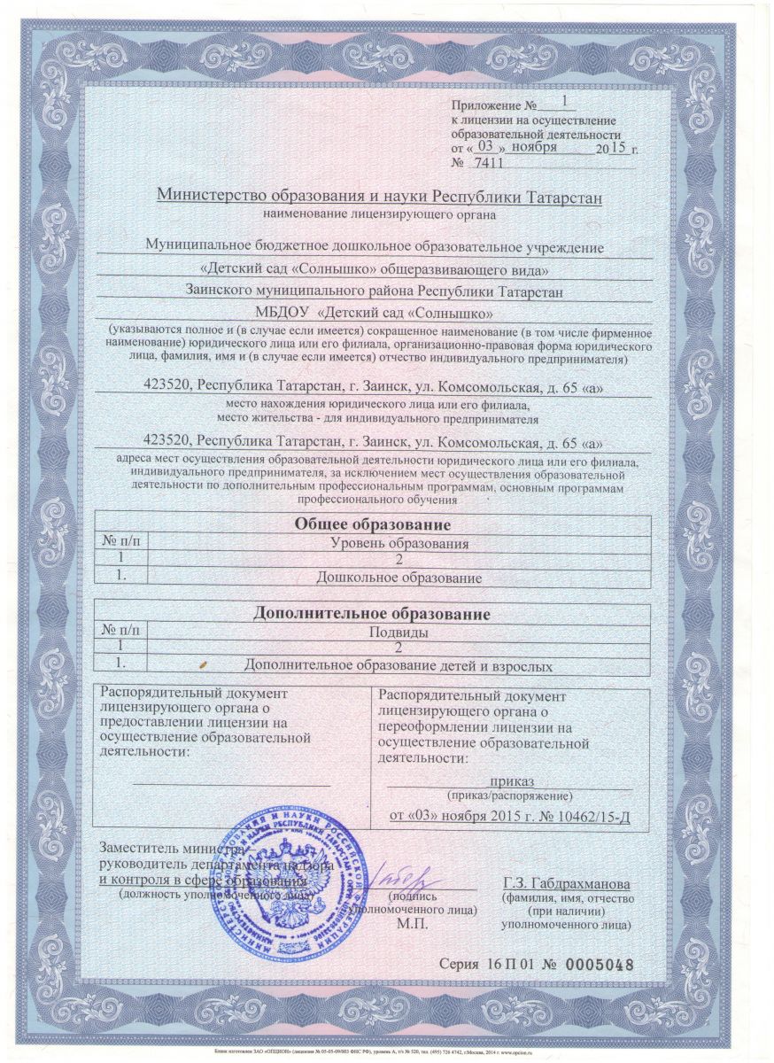 О лицензии на осуществление образовательной деятельности - Лицензия на осуществление образовательной деятельности.pdf от 03.11.2015 г. № 7411, - Приложение к лицензии на осуществление образовательной деятельности.jpg, выписка из реестра лицензий на осуществление образовательной деятельности