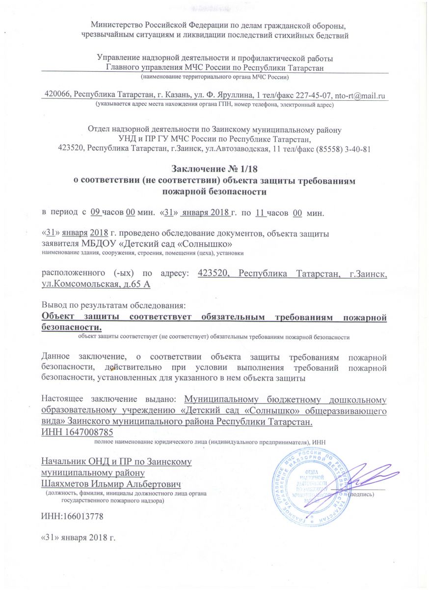 Заключение о соответствии объекта защиты требованиям пожарной безопасности от 31.01.2018г.