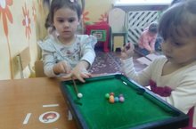 Интересной находкой оказалась игра "Мини-бильярд" для детей второй младшей группы, причем ею заинтересовались не только мальчики. Сегодня среди девочек состоялся турнир по забиванию шаров своего цвета в лузы. Игра "Мини-бильярд" развивает глазомер, учит координировать свои движения, просчитывать ходы, чтобы добиться намеченной цели. Ведь главное в игре - это одержать Победу над соперником!