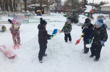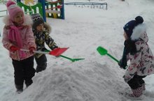 В холодное время года длительность пребывания детей на воздухе в значительной степени зависит от правильной организации их деятельности, от создания необходимых условий для физических упражнений, веселых игр и развлечений. Зима дарит детям и свои особенные радости, веселые забавы на снегу, на льду. поэтому подготовительная группа "Петушок" стали благоусьраивать свой участок так, чтобы можно было его использовать на физкультурных занятиях. Для оформления зимнего участка воспитатели решили изготовить горку, лабиринт, чашу для метания. При оборудовании площадки для игр предусмотрели возможность для разнообразных движений. Постарались сделать снежные фигуры, помогающие закрепить двигательные умения ребят. В этой работе с удовольствием принимали участие и дети. Одни подвозили снежные комья, другие подносили в ведерках и на лопатках рыхлый снег, третьи изготовляли цветные льдинки для украшения построек. Большое внимание воспитатели уделяют организации игр детей. Они охотно проводят самостоятельно различные сюжетно-ролевые игры: то отправляются на охоту, то плывут в дальние страны, драматизируют сказки. В детском саду есть весь необходимый инвентарь для труда: детские лопатки, скребки. Стремясь воспитать привычку к труду, уважение к работе старших, желание самостоятельно выполнять несложные обязанности, воспитатели тем самым делают интересным пребывание детей на прогулке, воспитывают желание принять в ней участие. Этот труд способствует также воспитанию у них настойчивости, выдержки, самостоятельности. Дети охотно трудятся, когда им дают определенное задание. Гуляя на участке, дети получают эмоциональный заряд, развивается двигательная активность, а воспитателям это помогает решить цель и задачи, которые были перед ними поставлены. Дети растут у нас крепкие, закаленные, жизнерадостные, любят прогулки и веселые подвижные игры. Сократилось число простудных заболеваний, а это в наших условиях факт первостепенного значения.