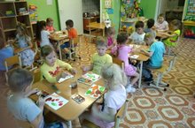 Малыши 1-мл. группы "Зайчонок" только начинают получать первые навыки лепки. Воспитатель Ю.И. Муханова на занятии лепки учит детей отщипывать маленькие кусочки пластилина и надавливающим движением указательного пальца размазывать пластилин на картоне. У всех ребят получилась своя снежная зима!
