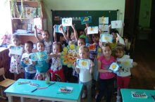Рисуют дети на асфальте,Цветных мелков цветной полет,На голубом ковре из небаЛетит веселый вертолет.Дети сегодня побывали в гостях у яркой и красочной Палитры. Палитра поиграла с ребятами, провела познавательную викторину. А потом дети рисовали цветными мелками на асфальте. -