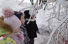 Сегодня дети средней группы "Светлячки" наблюдали за одним из красивейший явлений природы - инеем. Всё деревья и кустарники были покрыты нежнейшим сверкающим покрывалом. Педагог Сафронова Т. А. объяснила, что это капельки воды, которые замёрзли и превратились в снежинки. Такое явление называют инеем. Оно бывает в морозные ночи после тёплого дня. Капельки воды, находящиеся в воздухе, превращаются в кристаллики льда, и собравшись вместе они превращаются в серебристо-сверкающее покрывало, которое ложится на землю, на траву. Так дети познакомились с инеем. Вместе с воспитателем дети потрогали иней, и узнали что он тает и превращается в капельки воды. Дети внимательно рассматривали иней и были в восторге от такого явления.