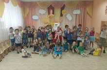 День рождение Деда Мороза прошёл сегодня в детском саду "Зернышко". Под задорные игры и танцы мы повеселили нашего деда мороза и спели ему каравай.