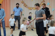 Мальчики и девочки старших и подготовительных групп с большим азартом принимали участие в эстафетах, читали стихи, танцевали. Папы с помощью своих дошколят "сражались" за звание настоящего мужчины в конкурсах. В конце праздника дети преподнесли папам и дедушкам подарки, выполненные своими руками в детском саду. -