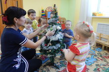 В преддверии Нового года мы с нашими малышками решили украсить нашу группу: Ребятки с большим увлечением помогали клеить на окна белые снежинки , вешать гирлянды, но самым увлекательным занятием было наряжать нашу маленькую но пушистую ёлочку.