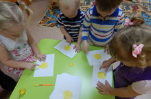 Сегодня у наших самых маленьких детей прошло занятие "Ласковое солнышко" (рисование пальчиками). Дети познакомились с понятием «лучик», учились рисовать пальчиками короткие линии, круг. Данный вид творчества способствует развитию мелкой моторики рук.