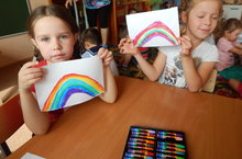 Сегодня у нас прошло занятие «В гостях у Радуги». Перед педагогами стояли следующие цели: познакомить воспитанников с цветовой гаммой радуги; учить различать предметы по цвету; формировать чувсвто красоты, видеть прекрасное; воспитывать желание заниматься изобразительной деятельностью. Мы с детьми рассматривали иллюстрации с изображением радуги, беседовали «Как возникает радуга?», читали рассказы про радугу, отгадывали загадки. Ребята рисовали «Радугу»; играли в игру «Что такого цвета?»