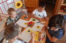 Сегодня мы решили устроить тематический день «Солнечный цветок – подсолнух». Мы вместе с детьми рассматривали иллюстрации с изображением подсолнуха, провели беседу «Подсолнухи», отгадывали загадки, рисовали. Задачей педагогов в этот день было расширить представление детей о подсолнухе, как о символе солнца и подсолнечнике, как о растении, из которого производят подсолнечное масло.