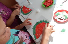 Сегодня мы посвятили день арбузу. Мы с детьми рассматривали картинки с изображением арбуза, провели беседу «Все об арбузе», отгадывали загадки, играли в игру «Сбей кегли «арбузом» (мяч с расцветкой арбуза), делали аппликацию «Арбуз».