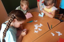 Ребята просмотрели презентацию «Многообразие бабочек»; отгадывали загадки. Очень интересно прошла подвижная игра «Превращение бабочки» (дети по команде воспитателя меняют движения: «бабочка» - бегают-летают по залу; «куколка» - останавливаются и замирают; «гусеница» - двигаются полуприсяде, поставив руки на пояс). Самые маленькие детишки повторили упражнение «Бабочка», которое они выполняют на утренней зарядке.