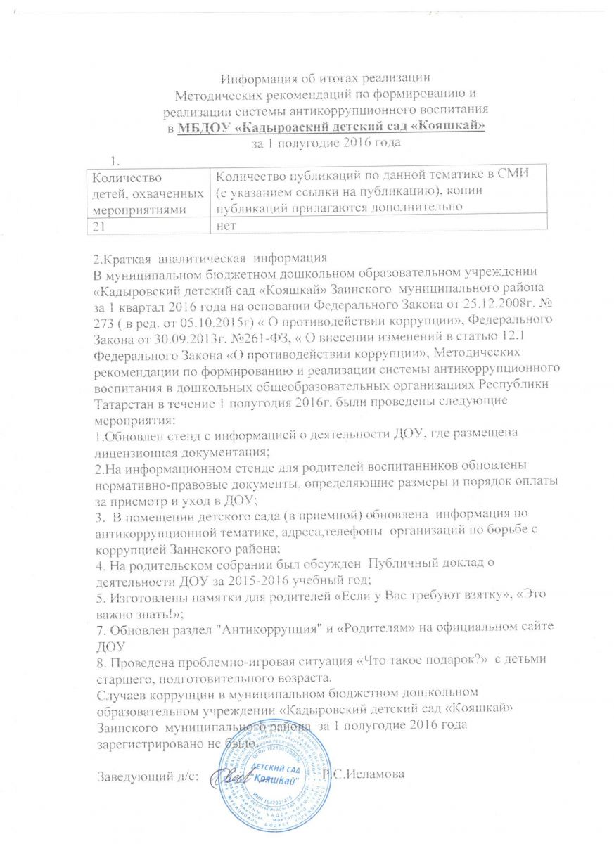 Отчет по антикоррупционной деятельности на I полугодие 2016 год